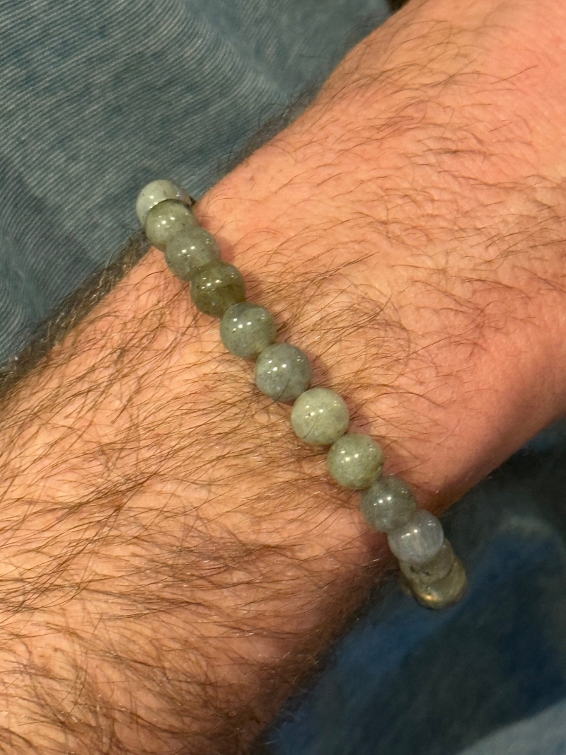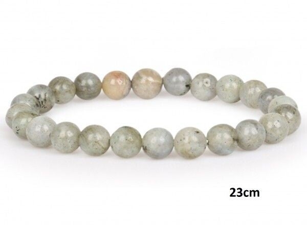 Uniseks elastische armband met 8mm steentjes en met een omtrek van 23cm waardoor hij geschikt is voor bredere polsen.