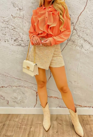 Blouse Lucinda Oranje is een blouse van het merk Schilo-Jolie. Het is een lichte blouse met lange mouwen en veel ruffles. Mooi combineerbaar voor carnaval; tevens ook modieus draagbaar.
