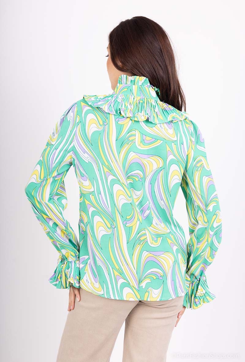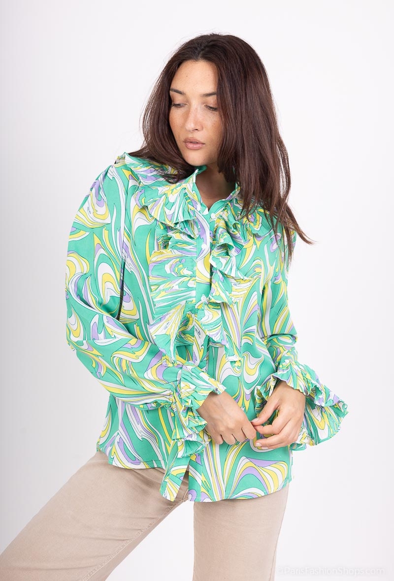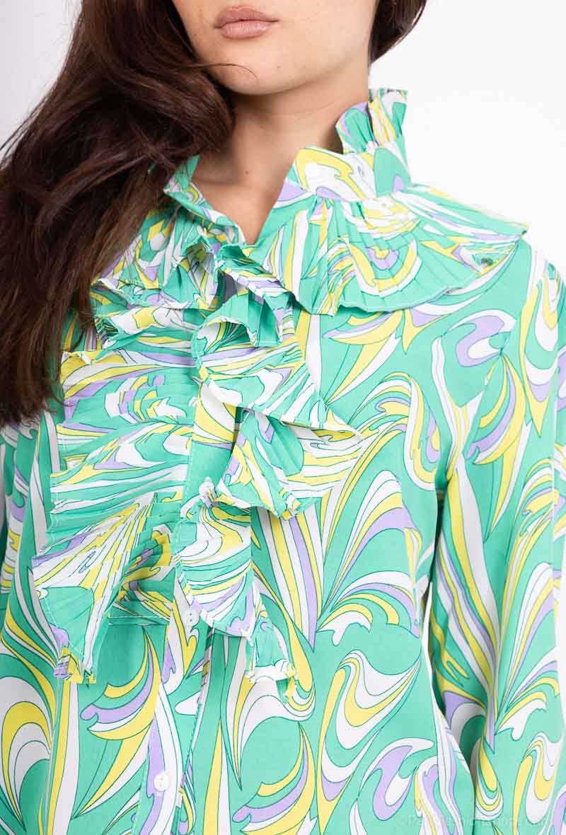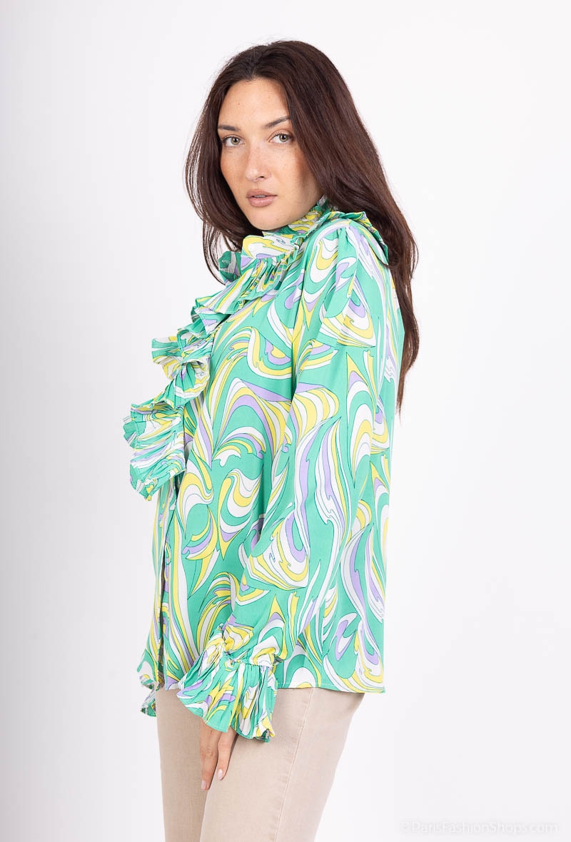 Blouse Lus groen is een blouse van het merk Luzabelle. De blouse sluit met knopjes en heeft lange mouwen. Manchetten, kraag en col zijn afgewerkt met ruffles. De blouse valt heel soepel.