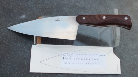Het heeft een blad van 180 mm lang, 62mm hoog in roestvrij messenstaal (1.4109) van 2mm. Het werd gehard, dan diepgekoeld op -78° en dubbel getemperd om een ideale hardheid en taaiheid te bekomen. Deze combinatie geeft een lang houdbare snede, die voor de meeste koks nog goed scherp te houden en te onderhouden is. Het roestvrije staal staat garant voor een lange levensduur met weinig onderhoud. Het mes kan generaties lang meegaan.
