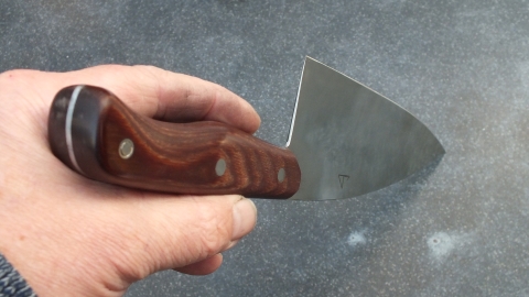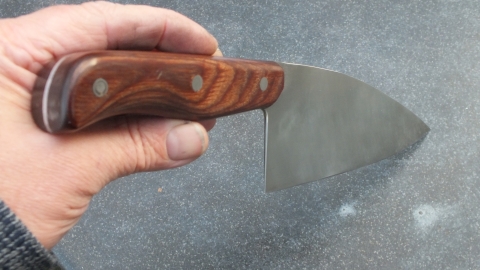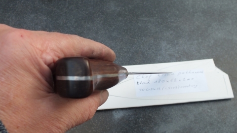 Het mes heeft een handvat in donker bruin pakkawood. ( Dit onder hoge druk en temperatuur samengesteld materiaal van fineer en phenolhars neemt geen vocht op en is hygiënisch) De schalen zijn bevestigd met epoxy en roestvrijstalen bouten.