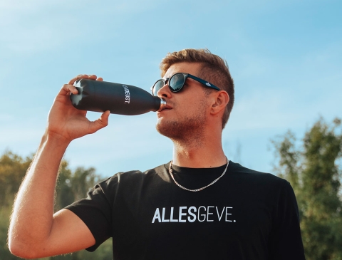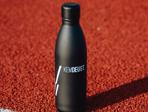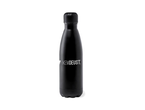 Stevige zwarte drinkfles met daarop de tekst KEMDEUST. Achteraan de bidon afgewerkt met de logo's van Sporting A en de tekst ALLESGEVE.