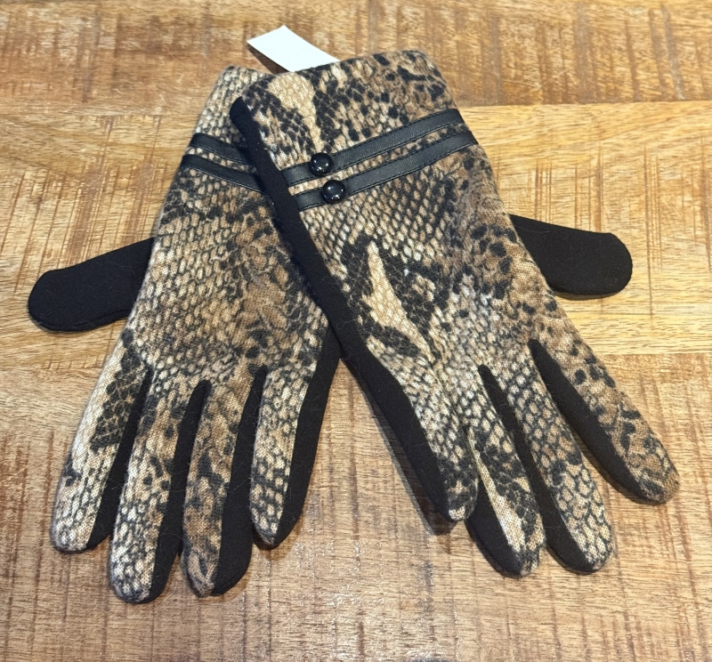 Mooie handschoenen met slangmotief en PU leren details met 2 knoopjes. Aan de onderkant van de duim en wijsvinger is een geborduurd hartje om je gsm te kunnen bedienen terwijl je ze draagt. 1 size