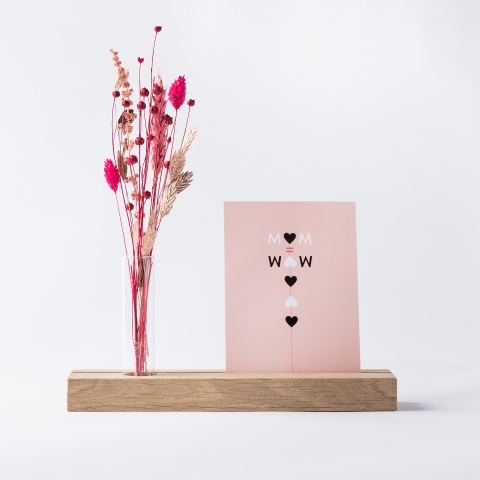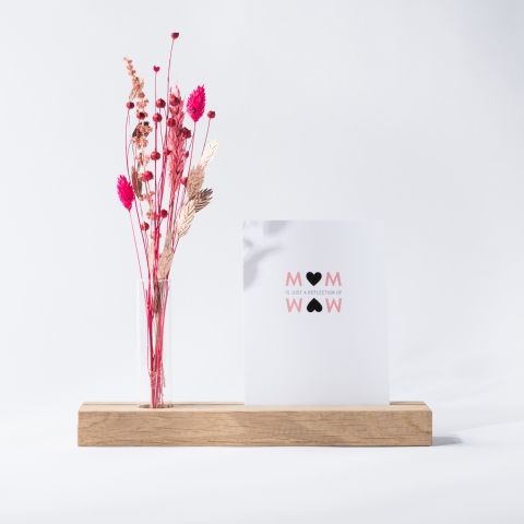 Mooie houten kaarthouder met een vaasje waarin naturel droogbloemen staan, geleverd excl kaart. Kies zelf een bijpassende wenskaart of foto