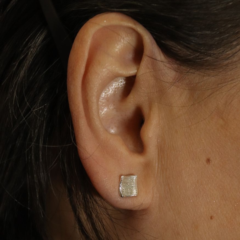Zilveren vierkante oorstekers met een gestreepte structuur.