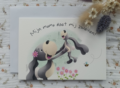 Formaat postkaarten: A6 (148mm x 105mm) Inhoud: 1 gevouwen kaart, 1 omslag en 1 sticker aan de hand van de wenskaart.