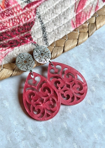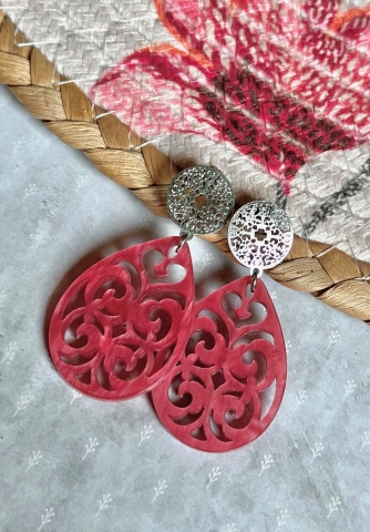 Deze roze-rode oorbellen zijn licht van gewicht dankzij de opengewerkte hangers van resin. Ze hangen aan zilverkleurige roestvrijstalen oorstekers.