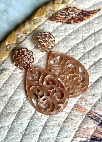 Deze nude oorbellen zijn licht van gewicht dankzij de opengewerkte hangers van resin. Ze hangen aan rosékleurige nikkelvrije oorstekers in de vorm van een bloem.