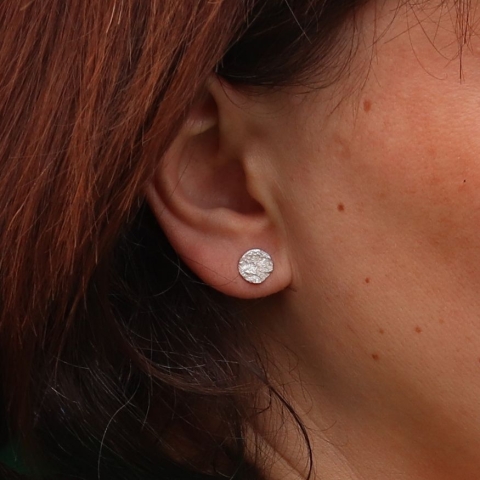 Zilveren ronde oorstekers met een structuur van houtschors.