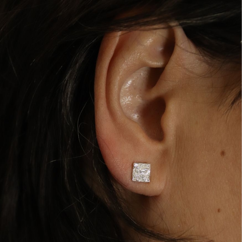 Zilveren vierkante oorstekers met een structuur van houtschors.