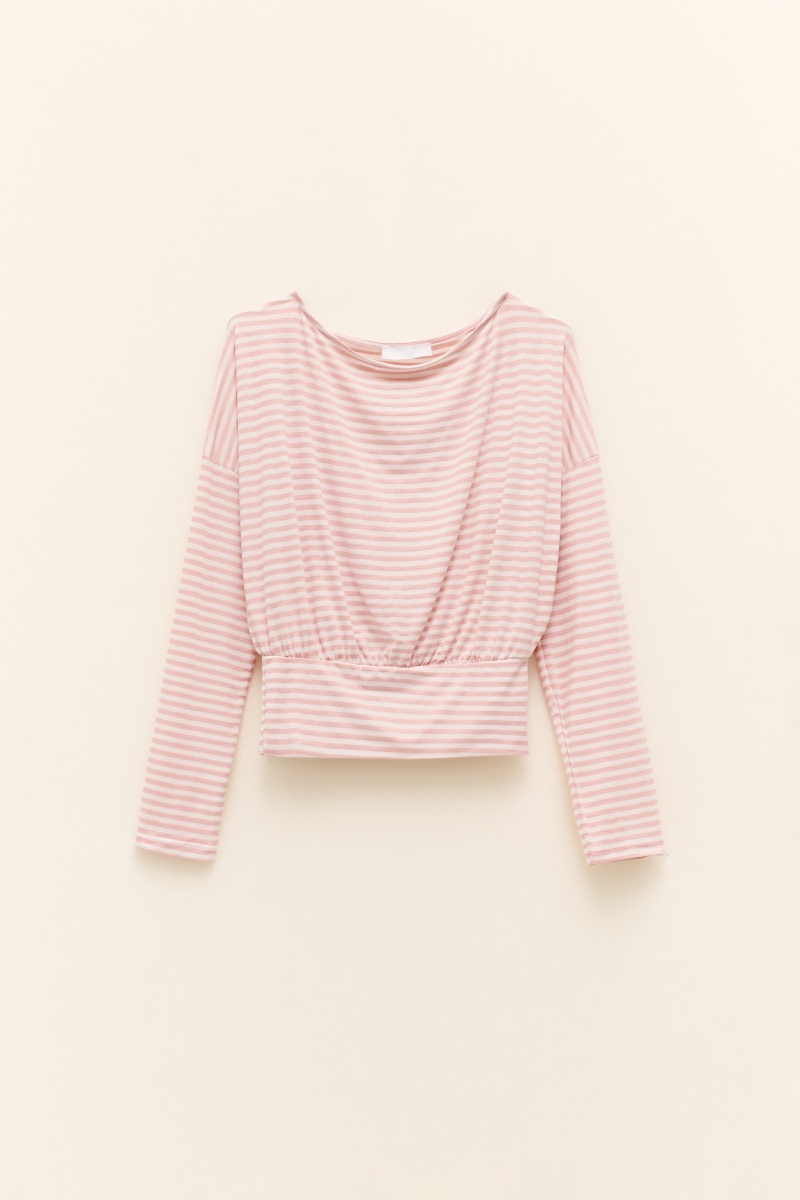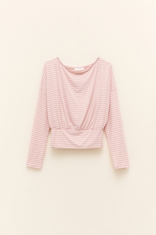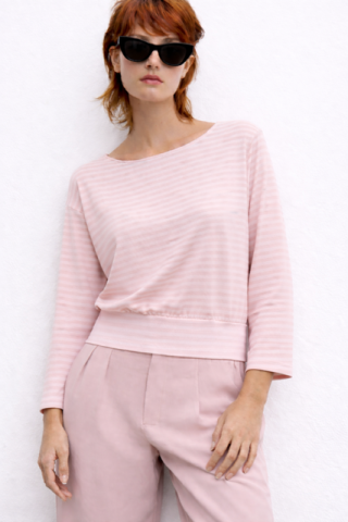 Het Shirt met boord Rosalumina is een leuk, gestreept en comfortabel item van het Italiaanse merk Lumina. Dit roze-wit gestreepte shirt combineert een tijdloos patroon met een moderne, flatterende pasvorm. Perfect voor vrouwen die houden van een casual sportieve uitstraling met een verfijnde touch.