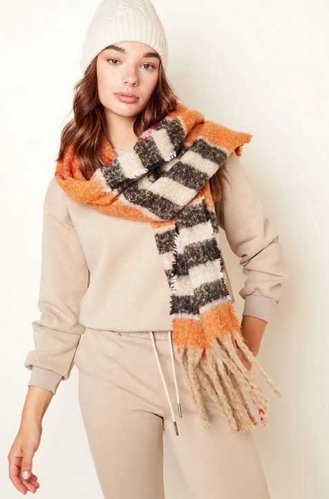 Deze trendy sjaal is tijdloos en geïnspireerd op een designermerk. Het patroon bestaat uit verschillende strepen in oranje, zwart en beige met daardoorheen een lijn in het rood. De sjaal heeft een afmeting van 180 cm x 40 cm en is gemaakt van 100% acryl, een zachte stof die niet kriebelt, maar wel genoeg warmte geeft.