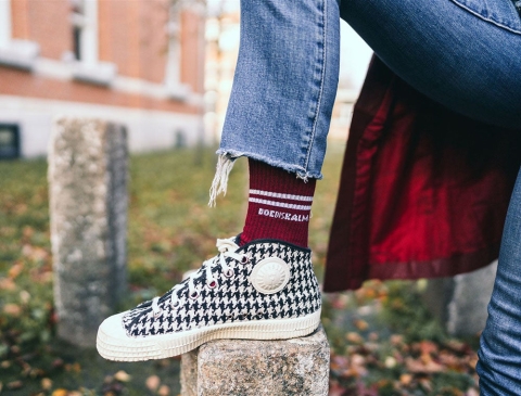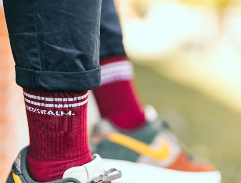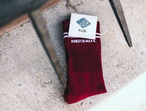 Comfortabele bordeaux sokken met opschrift DOEDISKALM. voor mannen en vrouwen. De kousen hebben een normale pasvorm met verdikking aan de zool voor extra comfort. Als cadeau of gewoon voor jezelf. Recht uit Antwerpen. Met trots voor het dialect.