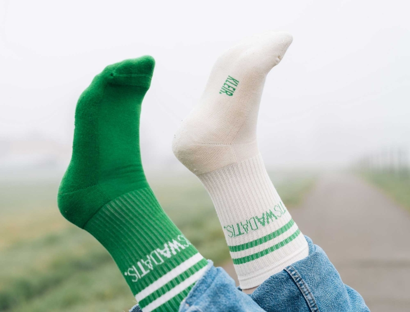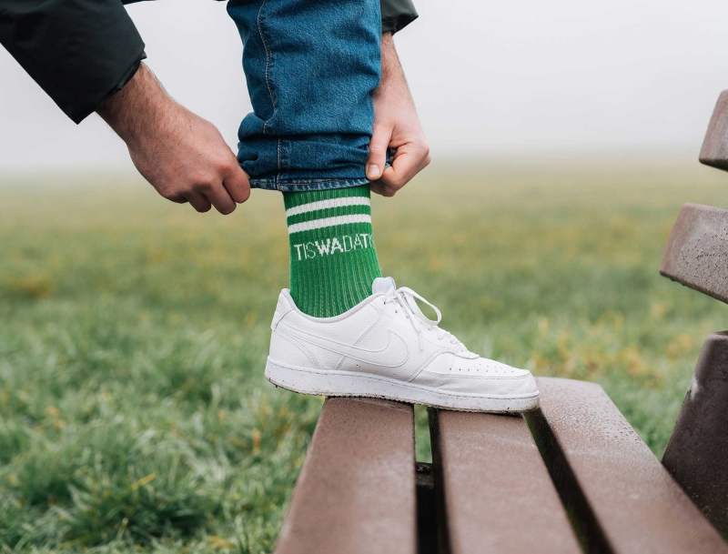 Comfortabele groene en witte sokken met opschrift TISWADATIS. voor volwassenen. De kousen zijn stevig, redelijk dik en hebben een normale pasvorm met een extra verdikking aan de zool voor extra comfort. Als cadeau of gewoon voor jezelf. Recht uit Antwerpen. Met trots voor het dialect.