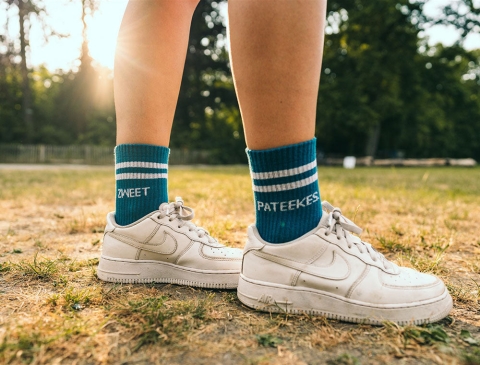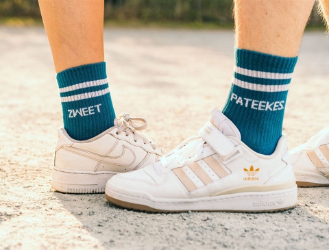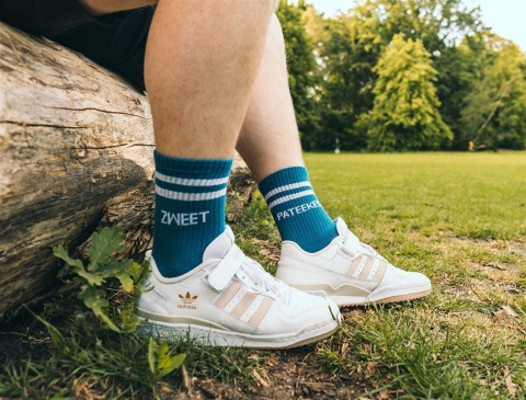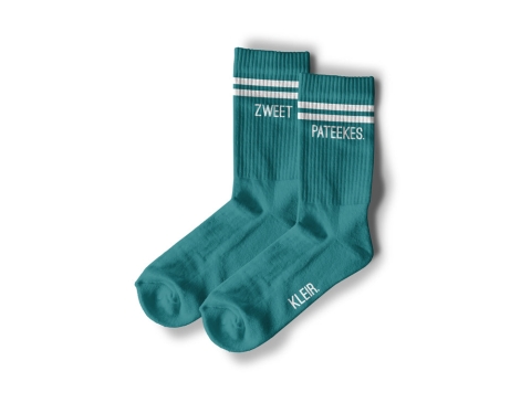 Comfortabele petrolblauwe sokken met opschrift ZWEETPATEEKES. voor volwassenen. De kousen hebben een normale pasvorm met verdikking aan de zool voor extra comfort. Als cadeau of gewoon voor jezelf. Recht uit Antwerpen. Met trots voor het dialect.