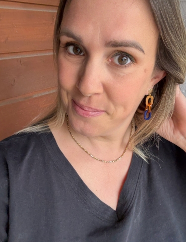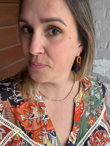 Totale lengte: 4,8 cm Totale breedte: 1,1 cm Materiaal: Gold plated, nikkelvrije messing, acryl Kleur: Cognac en donkerblauw