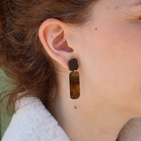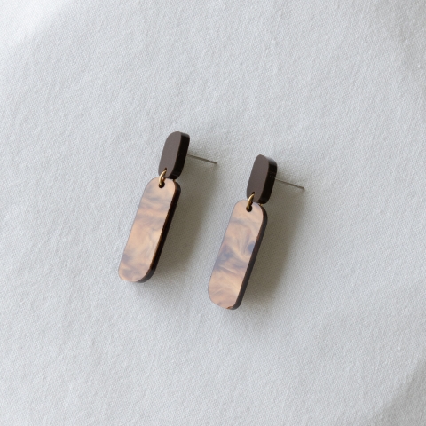 Totale lengte: 4,5 cm Totale breedte: 1,1 cm Materiaal: Gold plated, nikkelvrije messing, acryl Kleur: bruin