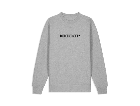 Grijze sweater met opschrift DOEDETNOGGEIRE? voor volwassenen. Als cadeau of gewoon voor jezelf. Recht uit Antwerpen. Met trots voor het dialect.