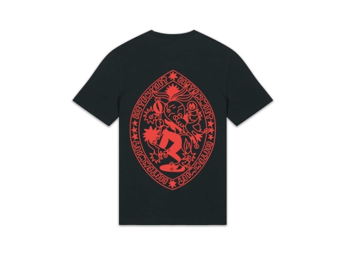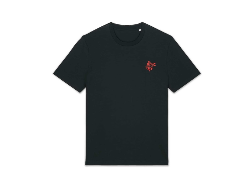 Zwarte T-shirt met een rode illustratie in 't groot op de rug en in 't klein op de borst. In samenwerking met de Antwerpse illustrator Auwnanas.