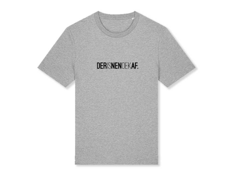 Grijze T-shirt met opschrift DERISNENOEKAF. voor volwassenen. Als cadeau of gewoon voor jezelf. Recht uit Antwerpen. Met trots voor het dialect.