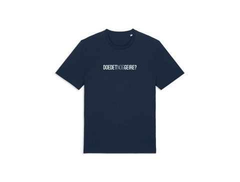 Donkerblauwe T-shirt met opschrift DOEDETNOGGEIRE? voor volwassenen. Als cadeau of gewoon voor jezelf. Recht uit Antwerpen. Met trots voor het dialect.