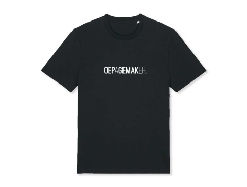 Zwarte T-shirt met opschrift OEPAGEMAKEH. voor volwassenen. Als cadeau of gewoon voor jezelf. Recht uit Antwerpen. Met trots voor het dialect.