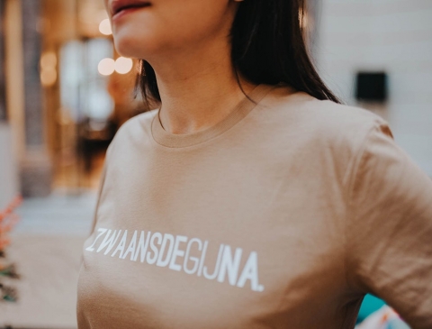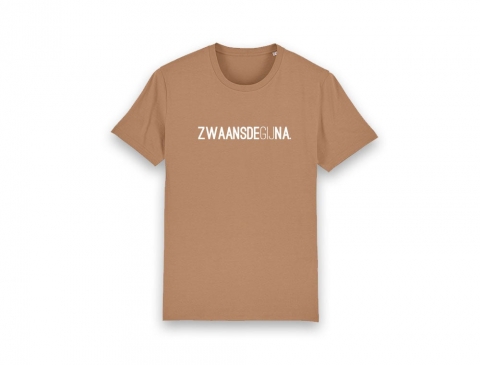 T-shirt in de kleur caramel met opschrift ZWAANSDEGIJNA voor mannen en vrouwen. Als cadeau of gewoon voor jezelf. Recht uit Antwerpen. Met trots voor het dialect.