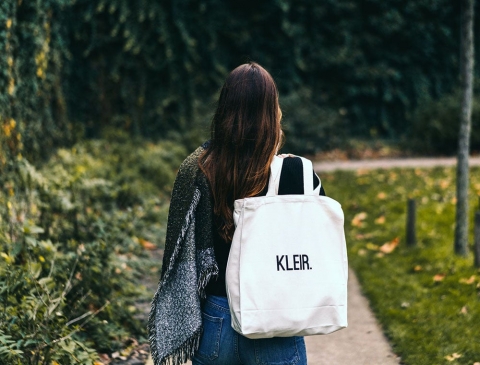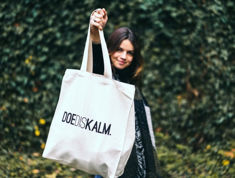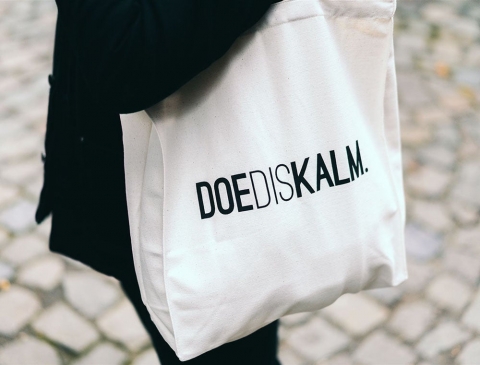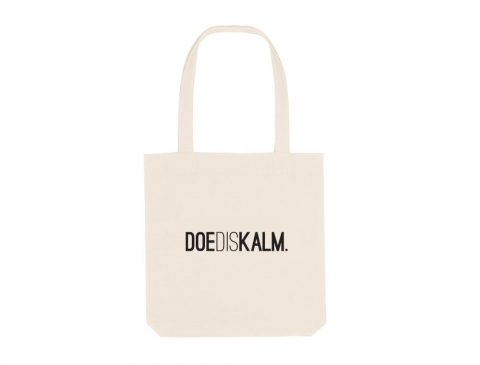 Stevige linnen zak met opschrift DOEDISKALM. aan de ene zijde en KLEIR. aan de andere kant.