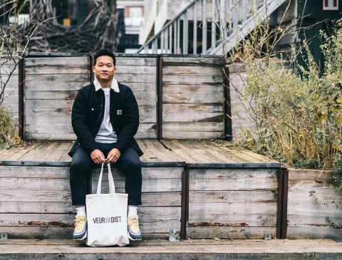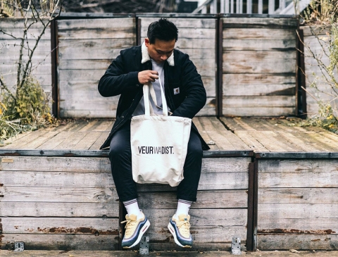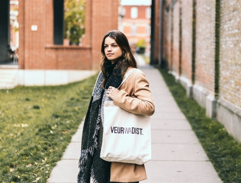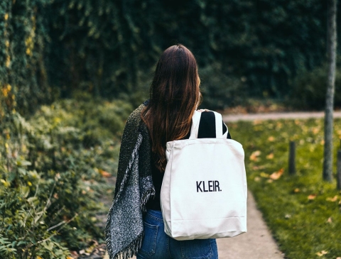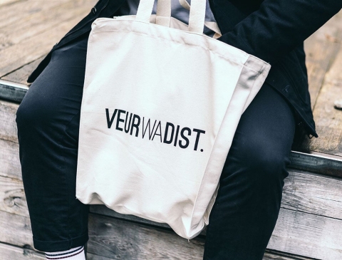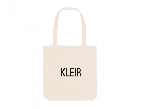Stevige linnen zak met opschrift VEURWADIST. aan de ene zijde en KLEIR. aan de andere kant.