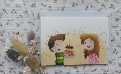 Formaat postkaarten: A6 (148mm x 105mm) Inhoud: 1 gevouwen kaart, 1 omslag en 1 sticker aan de hand van de wenskaart.