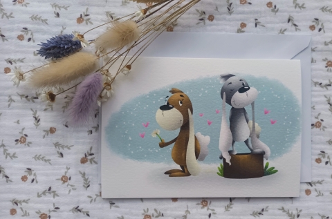 Formaat postkaarten: A6 (148mm x 105mm) Inhoud: 1 gevouwen kaart, 1 omslag en 1 sticker aan de hand van de wenskaart.