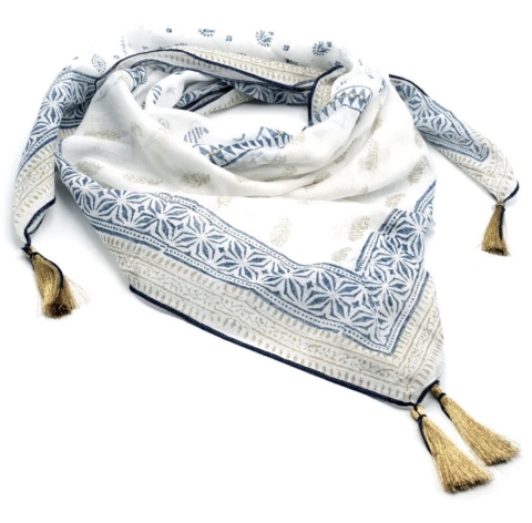 Vierkantige, witte sjaal met blauw en beige motiefje en grote goudkleurige kwastjes.