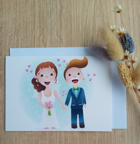 Formaat postkaarten: A6 (148mm x 105mm) Inhoud: 1 gevouwen kaart, 1 omslag en 1 sticker aan de hand van de wenskaart.